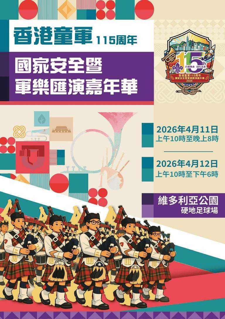 作为115周年系列活动的重头戏,「国家安全暨军乐汇演嘉年华」将于4月11日至12日在维多利亚公园举行,活动融合军乐汇演、历史展览、互动摊位及特色表演,免费向公众开放。有兴趣的市民及游客可在3月10日至25日期间,登入总会官网(https://www.scout.org.hk/115carnival) 进行免费登记,成功登记后即可于活动当日到现场领取门票入场。欢迎全国民众,特别是内地同胞亲临香港,在欢乐氛围中增进对国家安全的认识,共享童军百年的喜悦与荣光。温馨提示,现场有POP GIFT与香港童军总会联合开发手办销售。